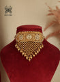 Bold and regal, the Kanak Choker is an ode to traditional grandeur. Crafted in antique gold with intricate embossed detailing, this choker features circular motifs adorned with sparkling stones and delicate pearl accents. The cascading mesh-like ghungroo drops create a dramatic silhouette, adding richness and movement to the design.