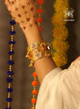 Radiating strength and elegance, the Anandhi Handcuff is a stunning statement piece rooted in traditional artistry. Adorned with intricate temple motifs, radiant stones, and delicate gold-toned detailing, it captures the essence of regal charm.
