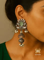 Delicately dramatic, the Ankita Earrings blend floral elegance with tribal artistry. Designed around a striking lotus motif in oxidized silver and pastel green accents, they cascade into layered metallic details and pearl drops. These earrings offer a perfect balance of tradition and grace, ideal for festive outfits, ethnic ensembles, or contemporary fusion wear.
