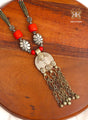 Bold and rooted in tribal elegance, the Manek Pendant brings together rustic charm and cultural richness. Featuring a circular antique-finish centerpiece with intricate motifs and cascading chain danglers, this piece is accented with vibrant red beads and floral silver elements. The layered strands add texture and depth, making it an ideal accessory for festive attire and boho-inspired looks.