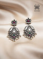 A classic beauty in oxidized silver, the Pancham Earrings feature intricate detailing with lotus motifs, mirror work, and tiny ghungroo-style beads that add a gentle charm. Hints of pink and green stones bring just the right touch of color. Perfect for festive occasions or a graceful ethnic look, these earrings blend tradition with timeless style.