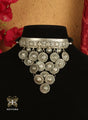 The Malika Choker is a celebration of heritage and power. Crafted in oxidised silver, this statement choker features cascading coin motifs adorned with intricate detailing, symbolizing prosperity and tradition. The floral engravings on the band enhance its regal appeal, while the layered fall design creates a dramatic silhouette that instantly elevates any look.